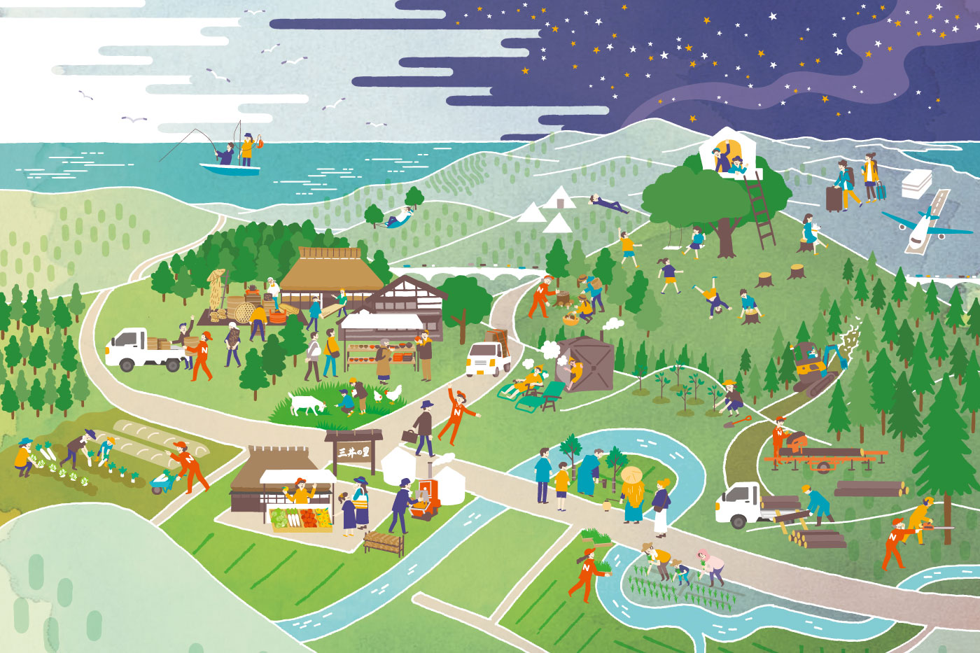 のと復耕ラボは、自伐型林業による「森づくり」、解体される家屋から古材や古家具を救い次へつなぐ「古材レスキュー」、田植え・収穫・茅刈り・小屋づくりなどの「里山活動」を柱に、地域の自然と暮らしを守り育てています。