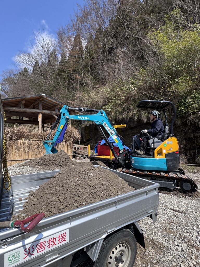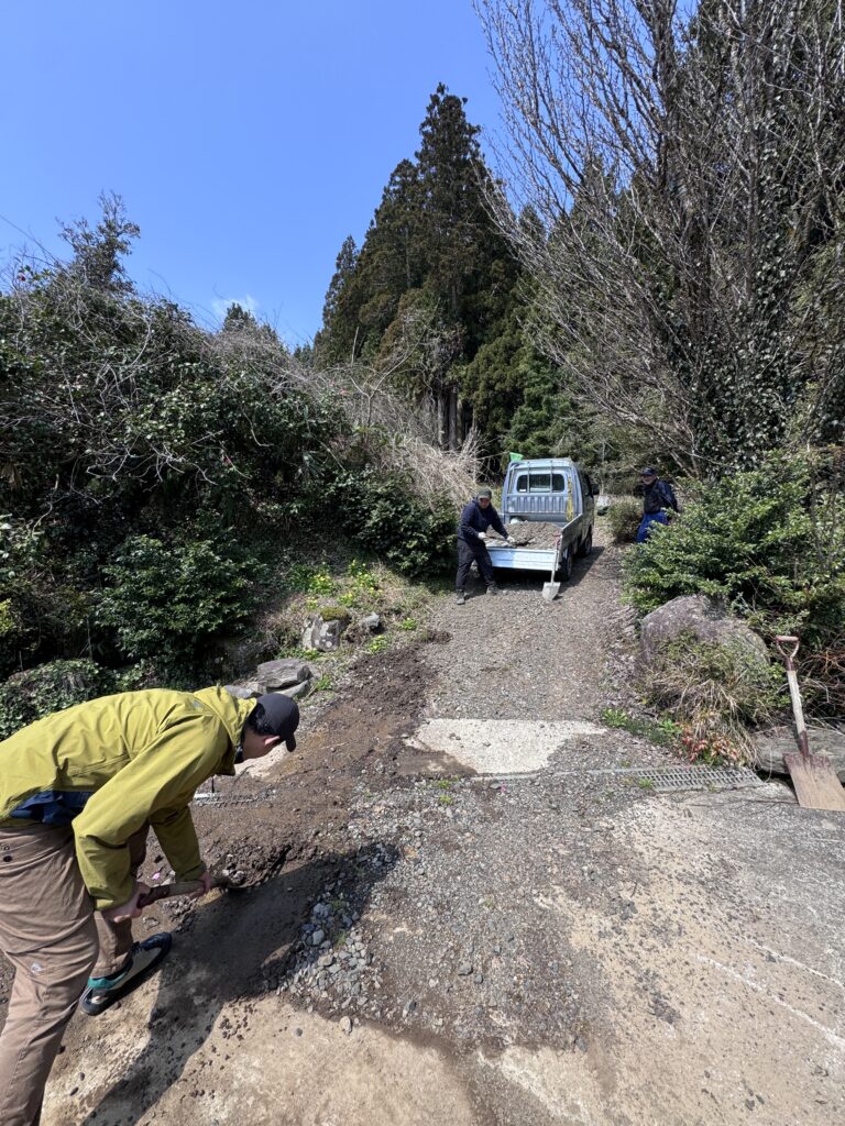 今日の午前中は林道の裏口の舗装を行いました。車で通る度にトラックのタイヤで掘れてしまうほど水分を多く含んだ道に砕石を撒いてセメントで固める作業を行いました。地権者様からお借りしている場所で堆石がどんどん落ちてきてしまっていたのも綺麗になり一旦これで解決?