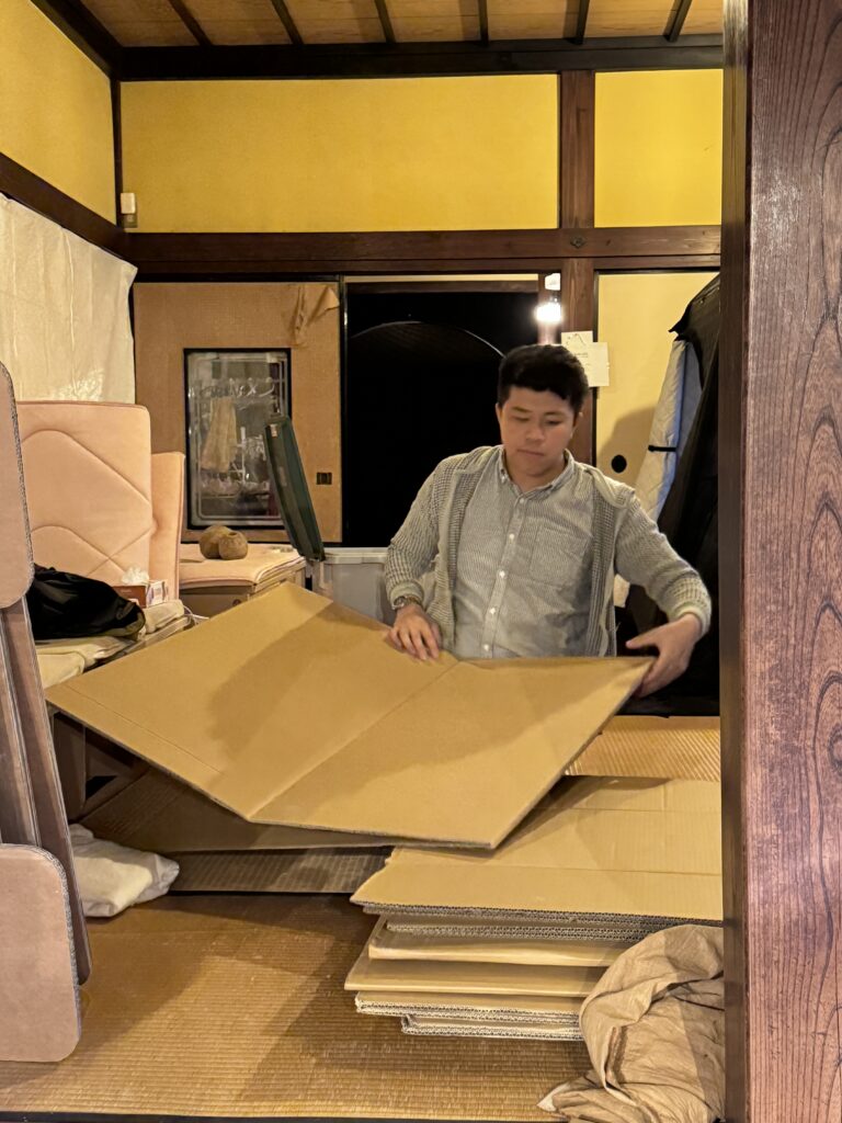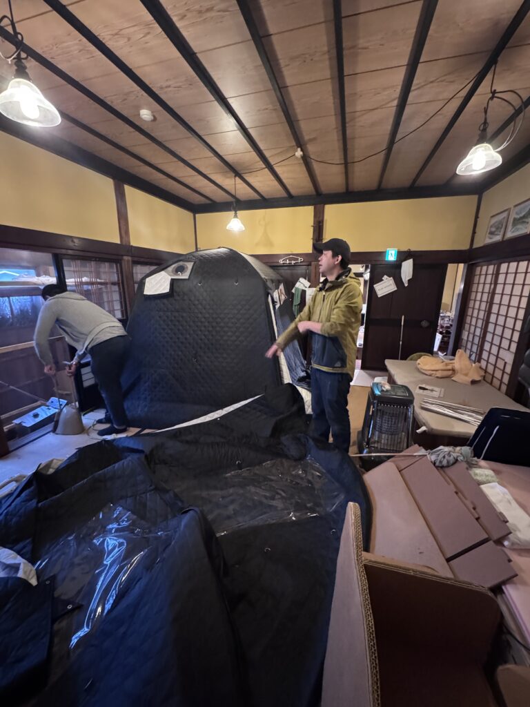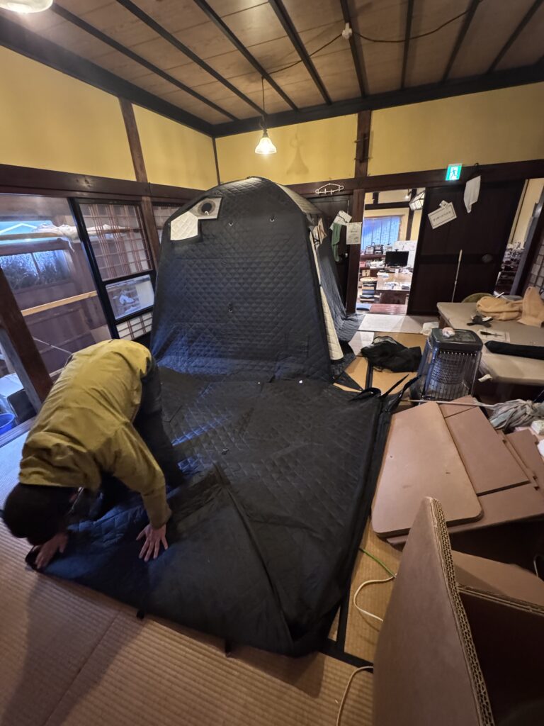 不要になった屋内テントの撤去、段ボールベッドの撤去、冬場に寒さ対策として気泡緩衝材(プチプチ)を取り付けたタッカーの芯を取り除く作業を行いました。